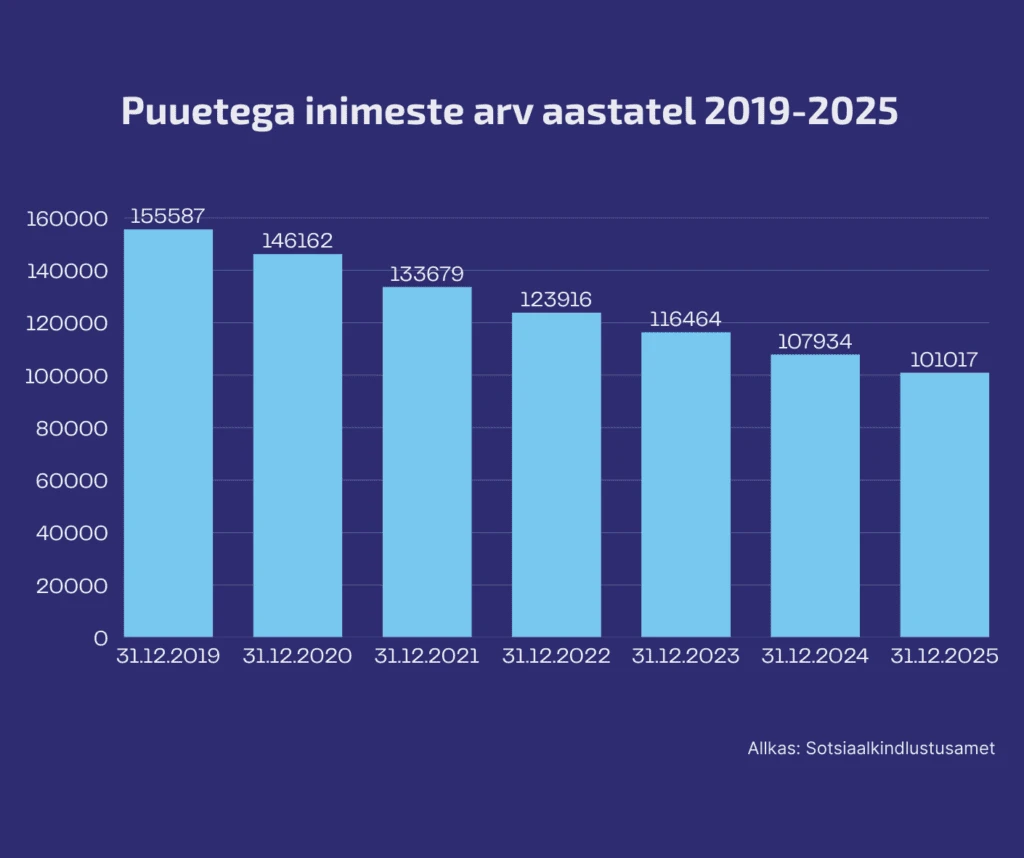 Sotsiaalkindlustusameti andmetel elas 31. detsembri 2025 seisuga Eestis 101 017 puudega inimest, mis moodustab 7,4% kogu rahvastikust. Võrreldes 2019. aastaga on puudega inimeste arv märkimisväärselt vähenenud.