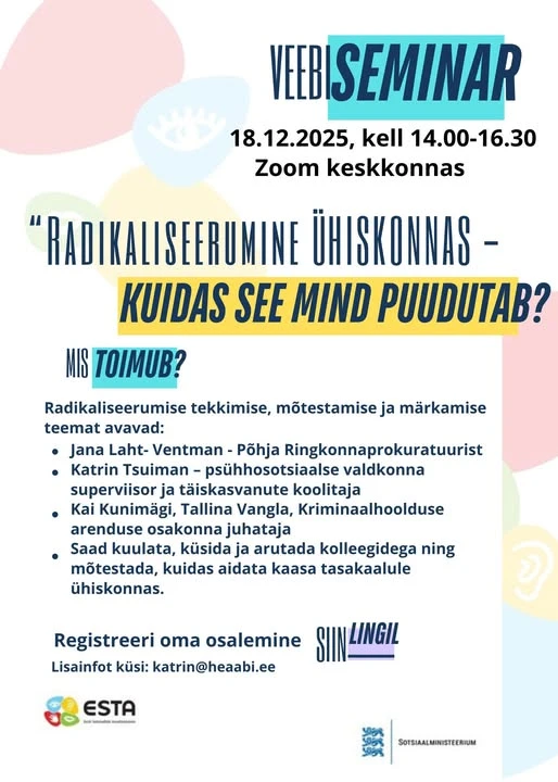 ESTA Lääne piirkond kutsub Sind ja Sinu kolleege osalema veebiseminaril „Radikaliseerumine – kuidas see mind puudutab?“, kus avatakse radikaliseerumise olemust, tekkepõhjuseid ning märkamise võimalusi just sotsiaalvaldkonna spetsialistide vaatenurgast.